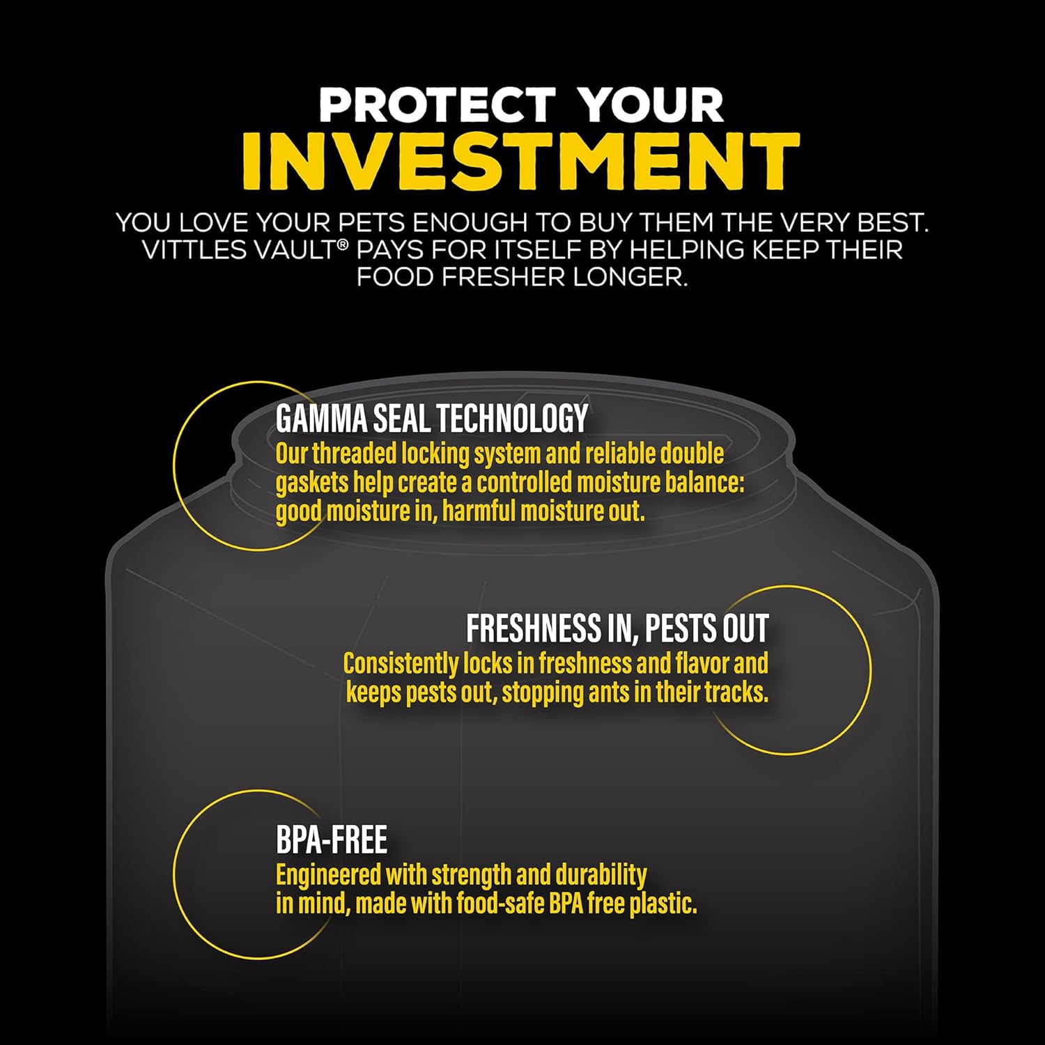- Say Goodbye to Pesky Pests: In addition to locking in freshness and flavor, GAMMA SEAL TECHNOLOGY keeps pests out, stopping ants and other insects out of this cat or dog food storage vault. Perfect for dry pet food