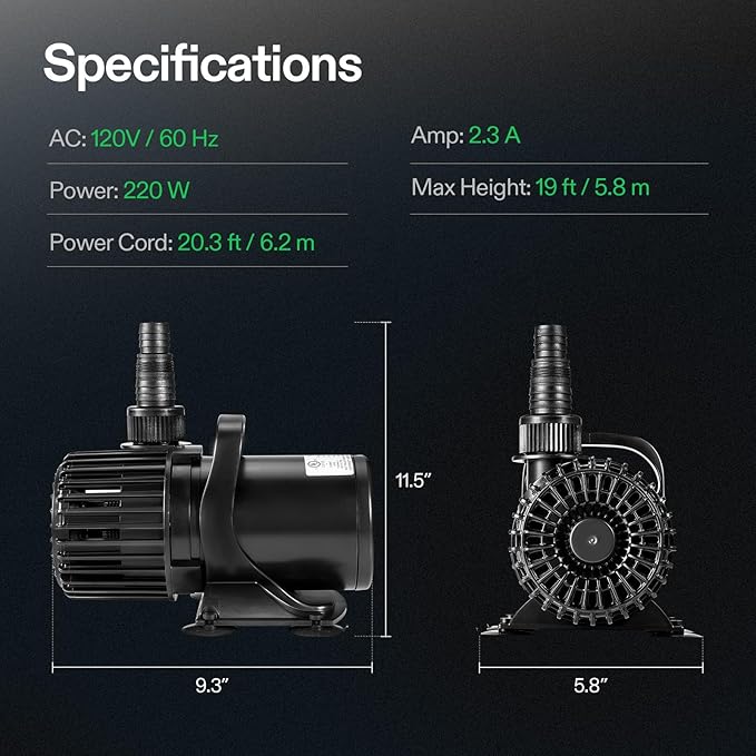- Energy Saving with Low Noise: Ultra-quiet operation design(30-40db); Less power (220W) consumption with high output (4500GPH/17000LPH) which compared to other pumps; Fits for 720 gallon pond
