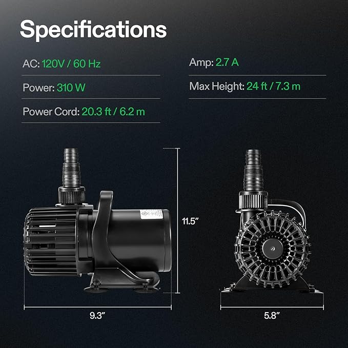- Energy Saving with Low Noise: Ultra-quiet operation design(30-40db); Less power (310W) consumption with high output(5300GPH/20000LPH) which compared to other pumps; Fits for 840 gallon pond