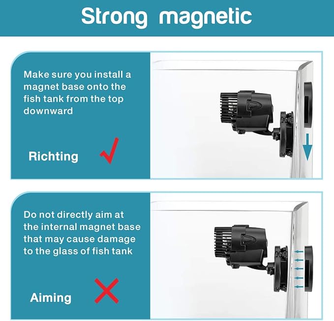 - EASY TO INSTALL: With a magnetic bracket which is easy to install and allows you to position the pump virtually anywhere in your aquarium. Forceful magnet, pay attention to the magnetic base to avoid pinching your hands when assembling
