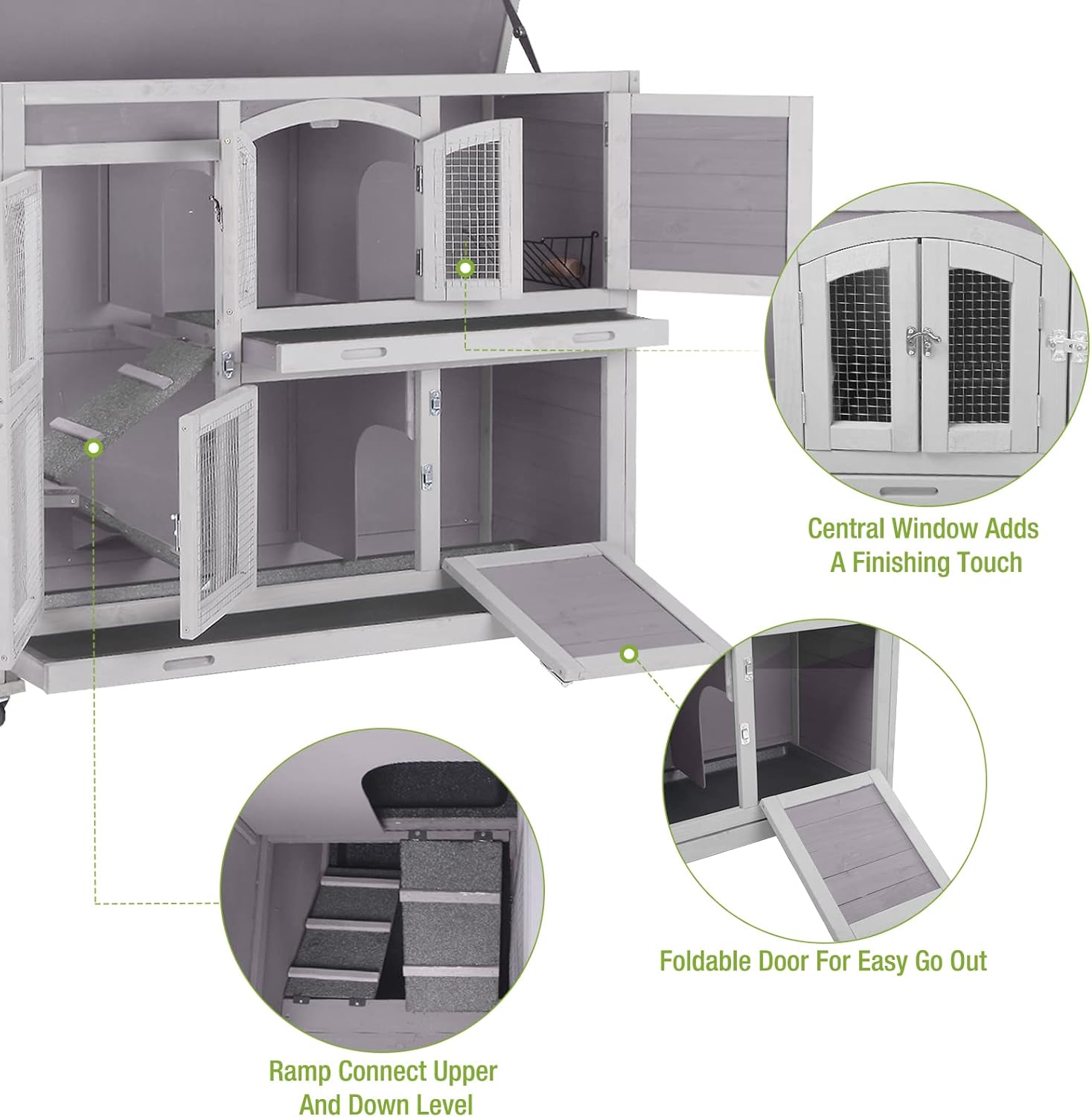 - Attractive Design: Central window adds a lots of funny, 4 lockable front doors provide unlimited view to bunny' activity