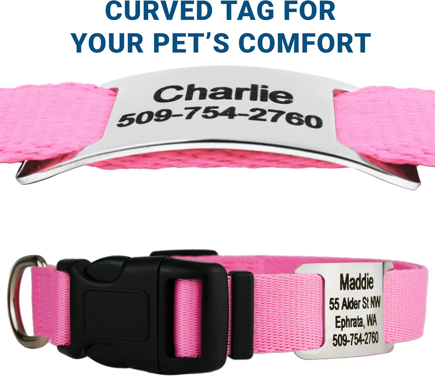 GoTags Personalized Dog Collar with Nameplate, Adjustable Dog Collar with Custom Engraved Slide On Pet ID Tag in Stainless Steel, Silent, No Noise Dog Tag for Large Medium and Small (Pink, Large)