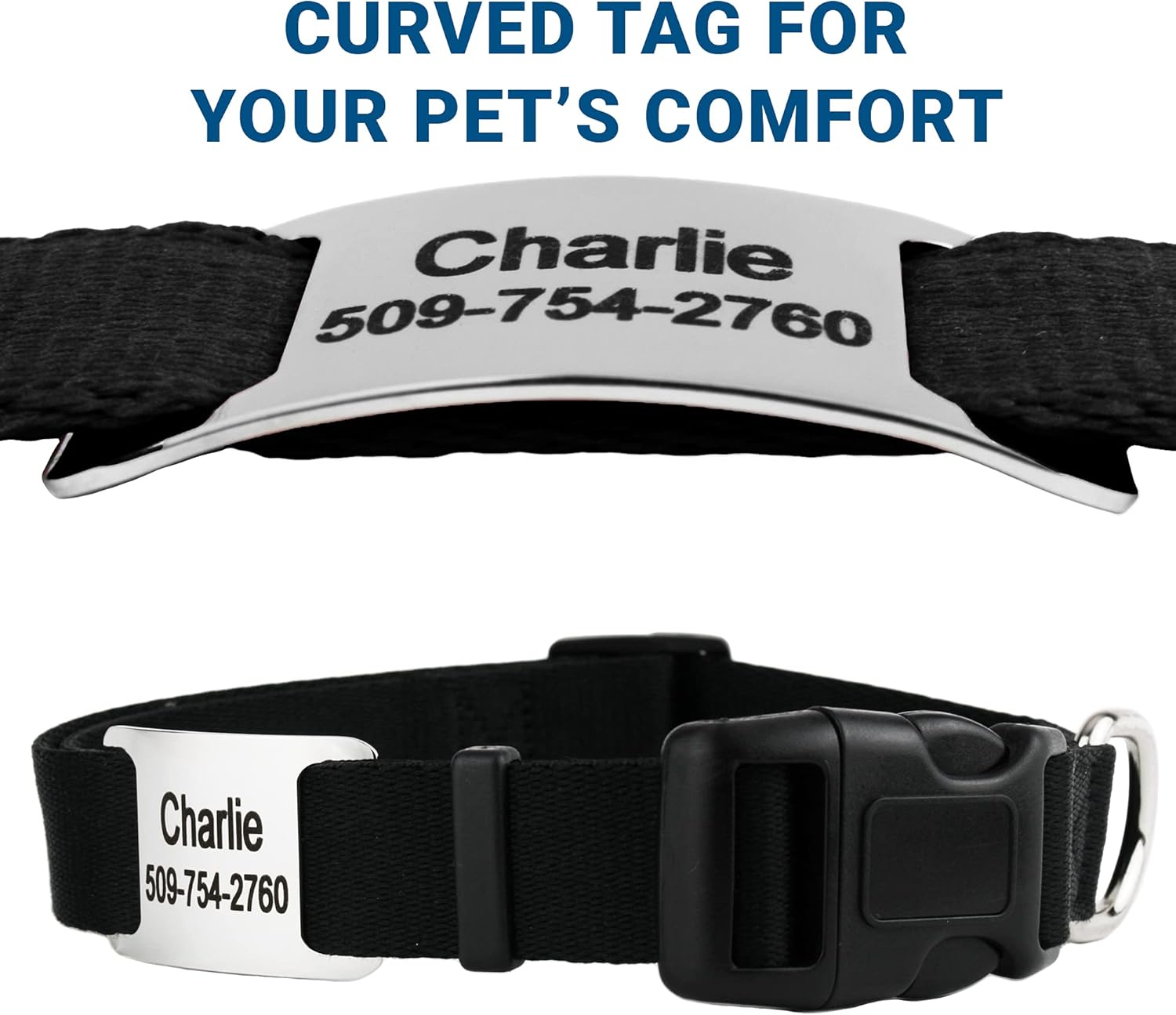 GoTags Personalized Dog Collar with Nameplate, Adjustable Dog Collar with Custom Engraved Slide On Pet ID Tag in Stainless Steel, Silent, No Noise Dog Tag for Large Medium and Small (Black, Small)