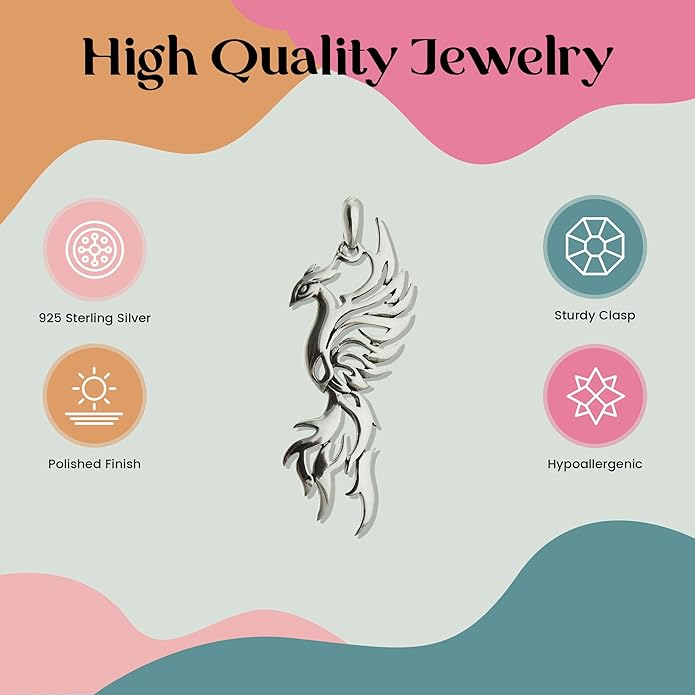 - Quality Sterling Silver Jewelry: Elevate your style and embrace the timeless beauty of our sterling silver jewelry Phoenix Necklace Designed for longevity, they boast anti-rust and anti-fading properties. Our sterling silver pieces prioritize your comfort, being hypoallergenic and gentle on the skin. It’s the perfect addition to your wardrobe, offering both style and durability. Whether you wear them for special occasions or daily glamor, rest assured they'll be cherished for years to come.