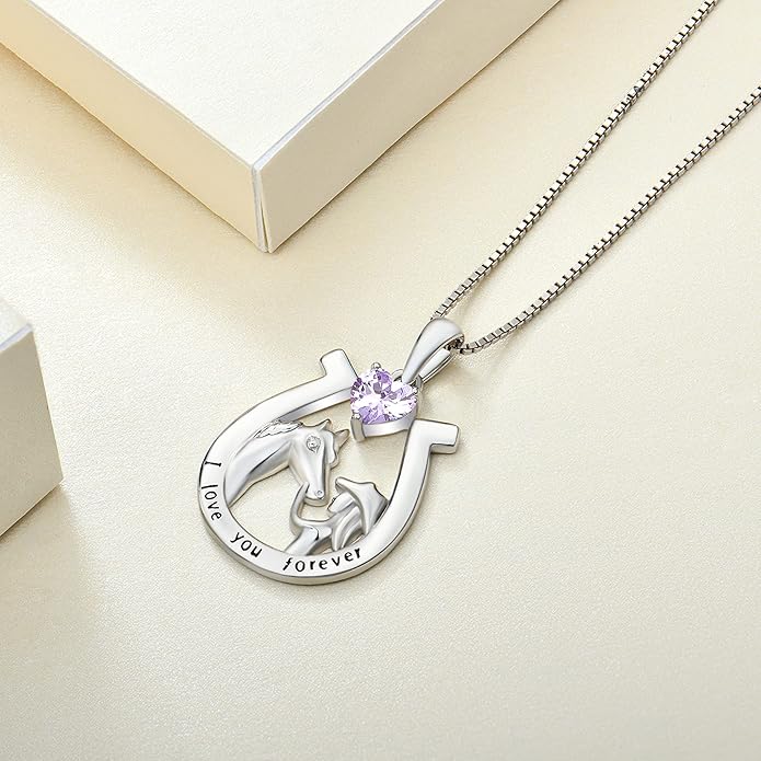 YL Women's Horse Necklace 925 Sterling Silver Horseshoe Pendant Birthstone Animals Jewelry