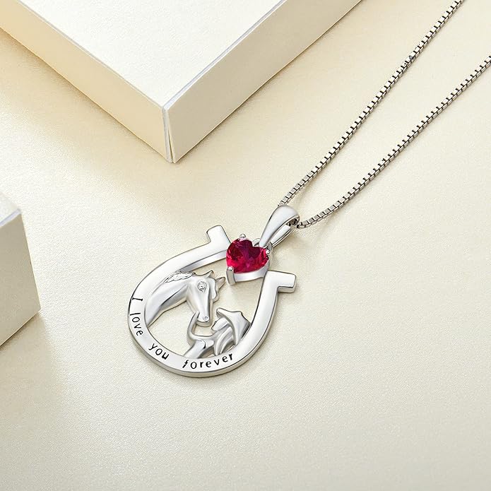 YL Women's Horse Necklace 925 Sterling Silver Horseshoe Pendant Birthstone Animals Jewelry