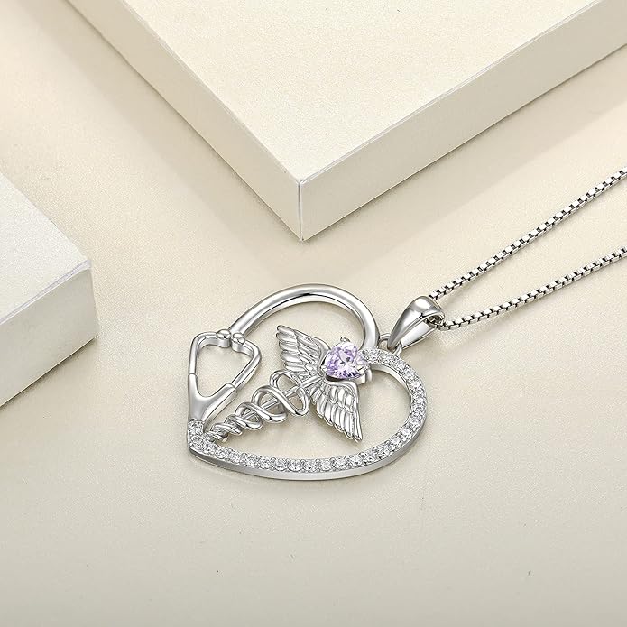 YL Caduceus Heart Necklace for Women Sterling Silver Doctor Nurse Themed Stethoscope Pendant Birthstone Angel Wings Snake Jewelry