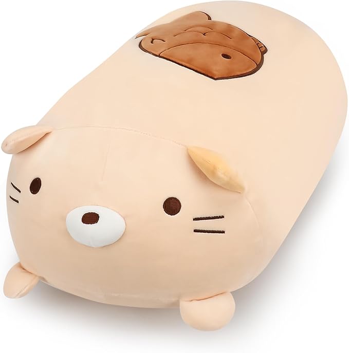 - Toast-Shaped Cat with Fish design: This plush buddy combines a square toast silhouette with an adorable cat face! The toast-like plush pillow is super soft and makes you want to take a bite out of it! The back features a playful embroidered fish pattern. Its minimalist design adds whimsy to a bed, couch or nursery.