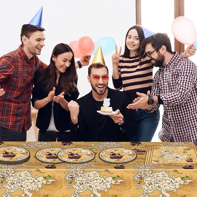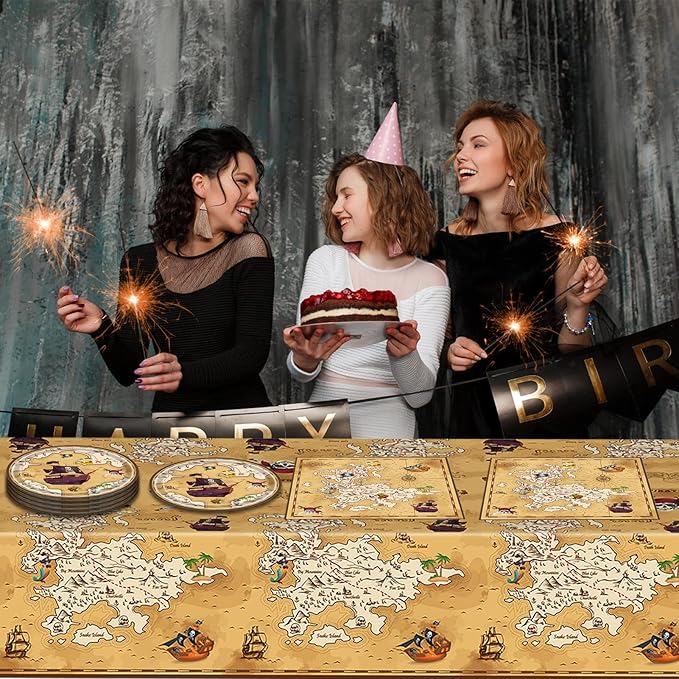 41 Pieces Pirate Party Tableware Set Pirate Birthday Party Decorations Includes Treasure Map Plates Nautical Napkins and Plastic Island Treasure Tablecloth for Treasure Theme Birthday Party Decoration