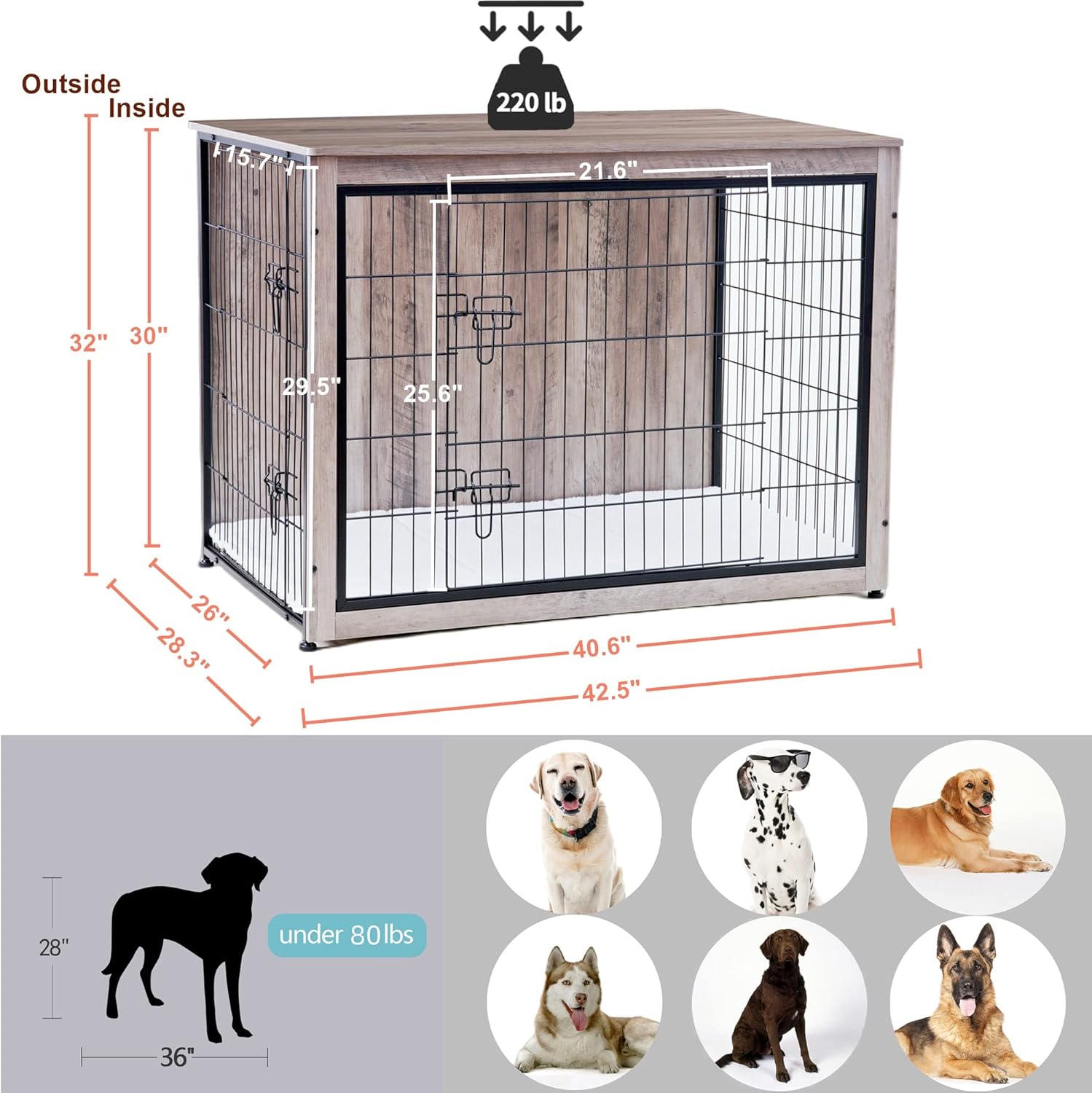 DWANTON Dog Crate Furniture with Cushion, Wooden Kennel Table with Double Doors, Indoor Dog House, Extra Large Size, 43.3" L, Greige