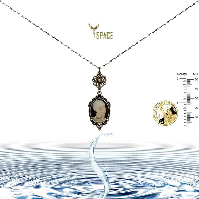 • Very good gift for present / Highest quality and unique design / Contents : Pendant, 2pc chain(18", 24"), Velvet Pouch(Deluxe pouch also help for gift use a drop of perfume and then perfect) / Material : Brass, Resin Cameo / Size : Pendant(1.49* 0.94inch), Chain(18, 24inch) / Weight : about 0.5 oz