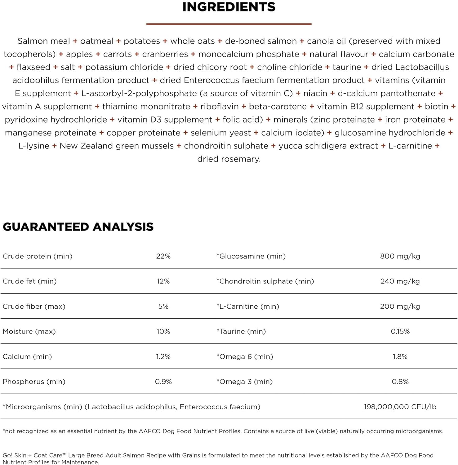 Go! Solutions Skin + Coat Care, Dry Dog Food, Large Breed Adult Salmon Recipe with Grains, 12 lb Bag
