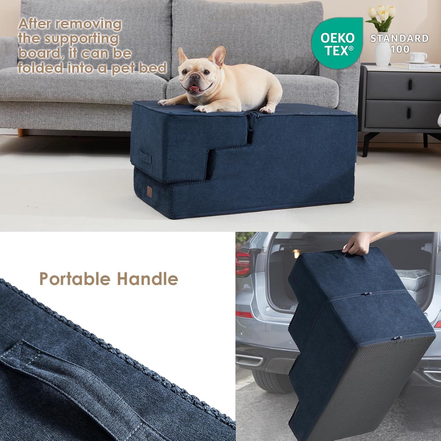 - STEADY & FOLDABE: With a 30D high density foam and eco-friendly support board, this dog stair offers enhanced stability. It can also be folded into a basic dog bed for your furry puppy to sleep.