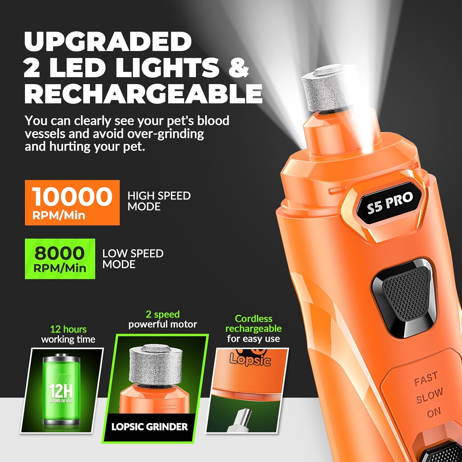 • 【Improved Precision: 2 LED Lights & Adjustable Speeds】: LOPSIC dog nail grinder for dogs features 2 LED lights that offer clear visibility of the quick, ensuring precise and safe nail trimming for your pets. The adjustable speeds(8,000 RPM to 10,000 RPM) of dog nail trimmers can adapt to small, medium and large pets nail trimming needs. When using the dog nail trimmers at the proper speed, pet nails of different hardness can be efficiently ground
