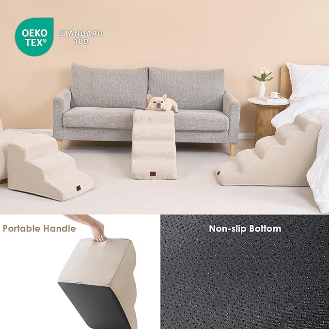 - COMFORTABLE PET STAIRS - This foam dog stair is designed directly against the edge of a bed, sofa or other furniture, so your pet can climb up and down comfortably.