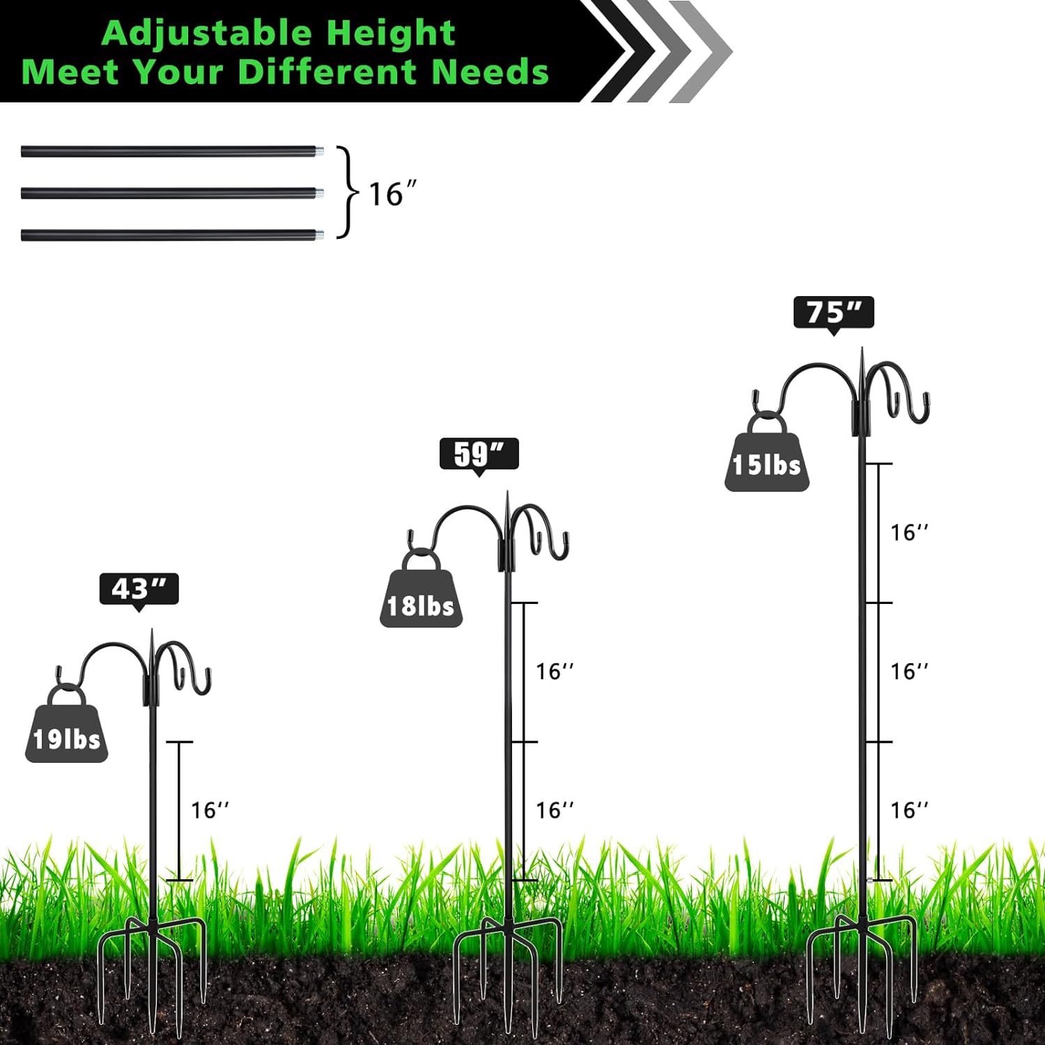 - 【FREELY ADJUISTABLE HEIGHT】Our bird feeder hangers are 76 inches high (including the base) and 16 inches wide. Each shepherds hook for bird feeder includes 3 extender pole with a length of 16 inches, you can free to adjust the suitable high. The height can be adjusted according to your requirements (44", 60", 76" ). The max load-bearing capacity of 76 inches is 15 lb.