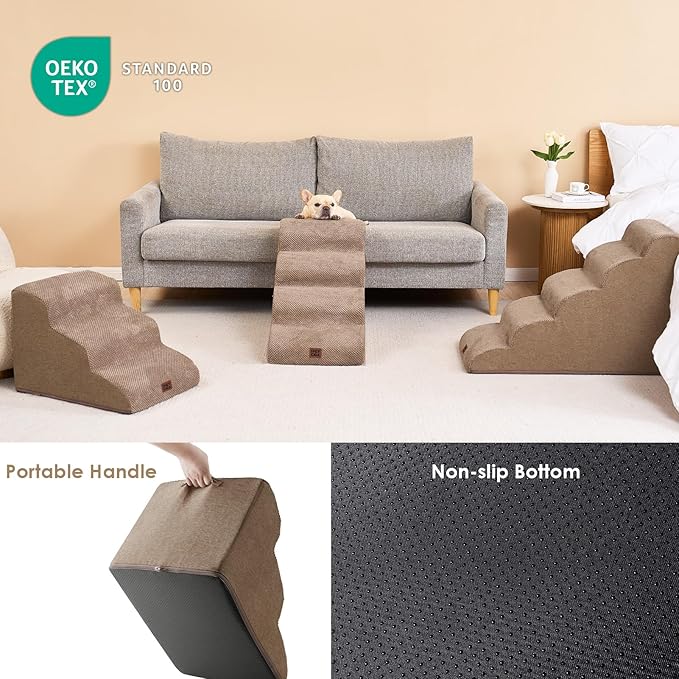 - SPECIFIC AND STEADY DESIGN - 33D density of pure foam make this stair more steady when your pets walk on. The dog bed stairs can provide strong support for pets in the walking process. Low angle slope design can better protect your pet's joints.