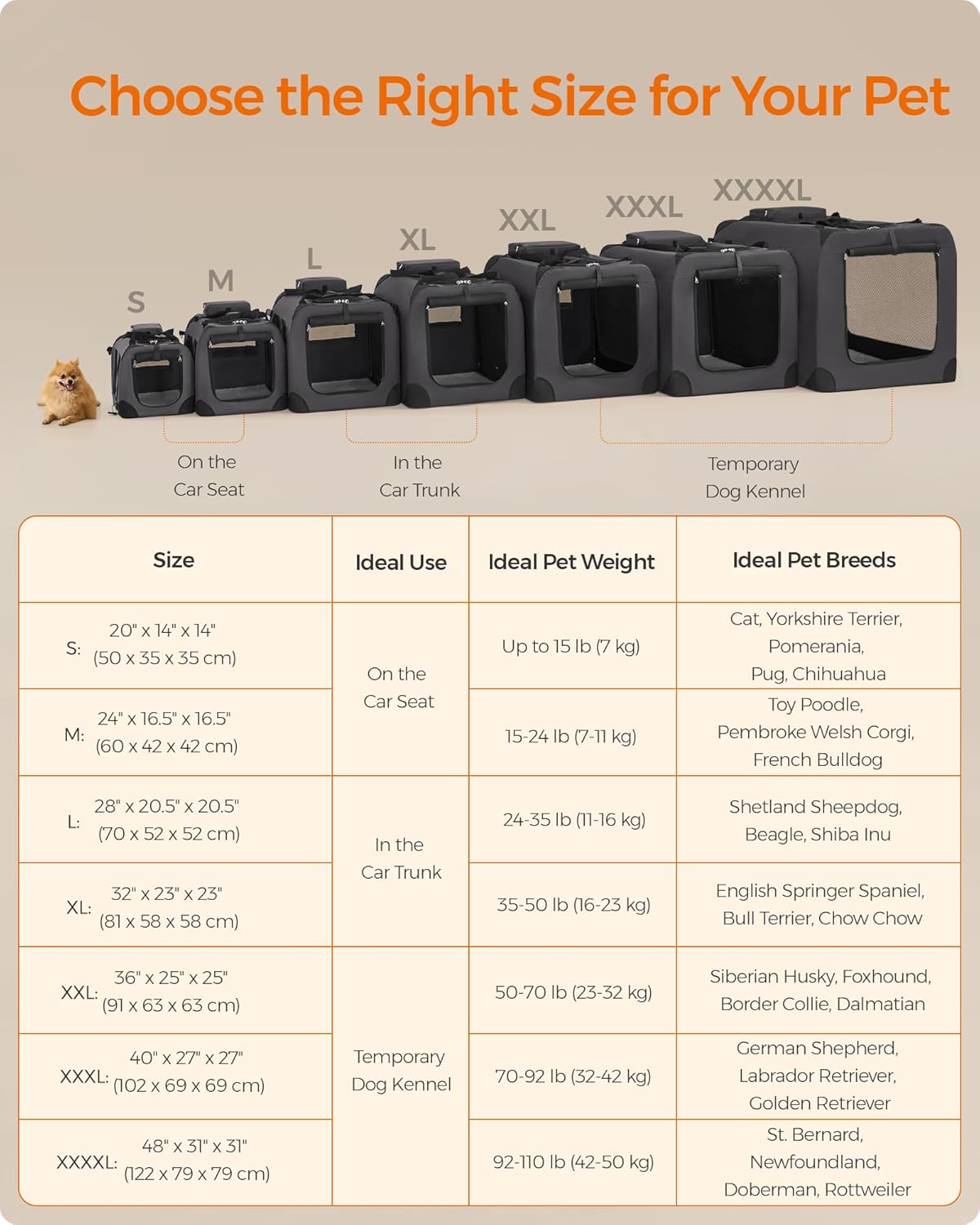 - 【CHOOSE THE RIGHT SIZE】This 36" x 25" x 25" collapsible dog carrier is ideal for pets between 50-70 lb. Please read our tips on the pictures to measure your pet and choose the right size