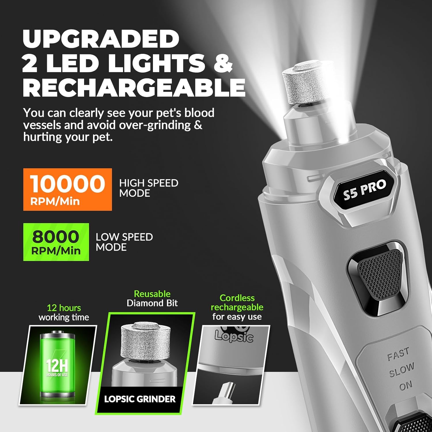 - 【Improved Precision: 2 LED Lights & Adjustable Speeds】: LOPSIC dog nail grinder for dogs features 2 LED lights that offer clear visibility of the quick, ensuring precise and safe nail trimming for your pets. The adjustable speeds(8,000 RPM to 10,000 RPM) of dog nail trimmers can adapt to small, medium and large pets nail trimming needs. When using the dog nail trimmers at the proper speed, pet nails of different hardness can be efficiently ground.