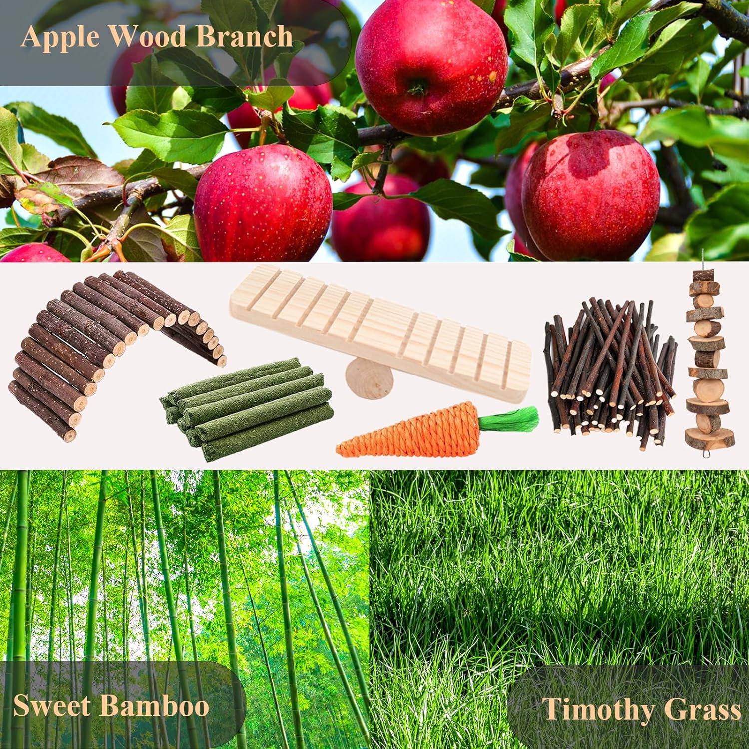 - 【100% Natural Chew Toys】Hamster toys all handmade, safe and harmless to small pet. Quality apple wood and timothy hay sticks for chewing and playing with,rich in nuitrition and vitamins,can help molar teeth ,improve digestion and increase appetite. Hamster chew toys can help the teeth chew and relieve the pressure of the cuties. Gerbil toys to play and molar,keep your lovely pets healthy and active.
