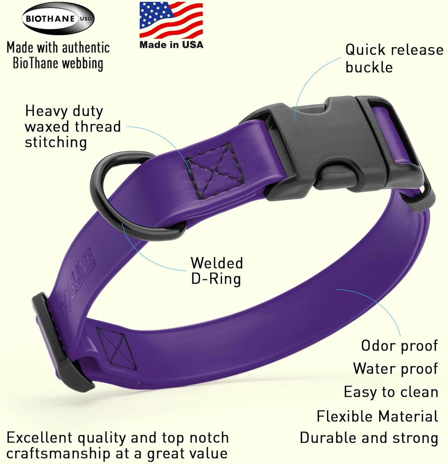 - Free your dog to romp in puddles and retrieve from lakes with the Dogline Biothane Waterproof Dog Collar with a Quick Release Buckle. This water-repellent collar stays dry and odor-free, without shrinking or losing flexibility. Not a chew proof material!
