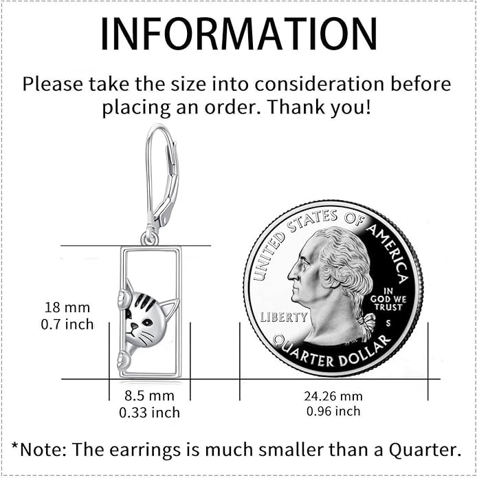 - 🐱Size Of Silver Cat Jewelry: The cute cat leverback earrings size is 0.7*0.33inch / 18*8.5mm. This animal jewelry gifts is light weight, so is very suitable for daily wear. Unique cat dangly earrings is a beautiful addition and will make you look even more gorgeous when you wear it. Beautiful cat earrings silver will nodoubtly makes you stands out. Great cat jewelry for women!