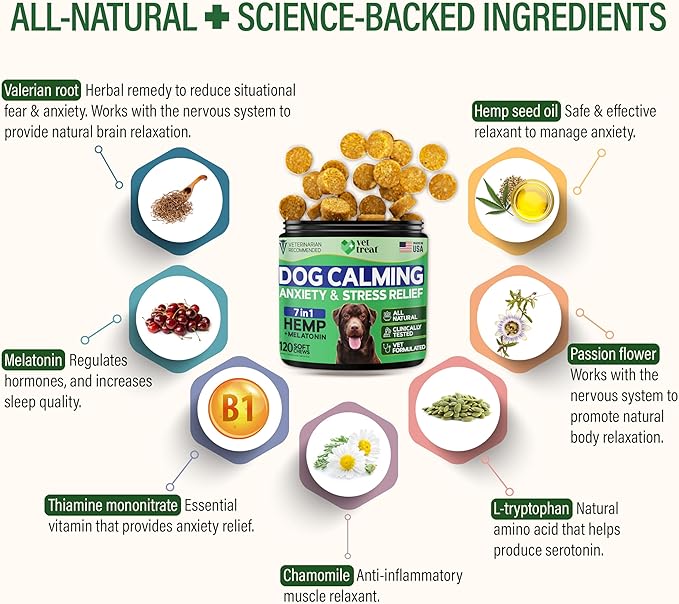 - Premium Natural Ingredients – Vet Formulated: Formulated by veterinarians, these calming chews feature natural herbs and hemp for dogs to reduce anxiety and promote well-being – with no artificial fillers, corn, or soy.