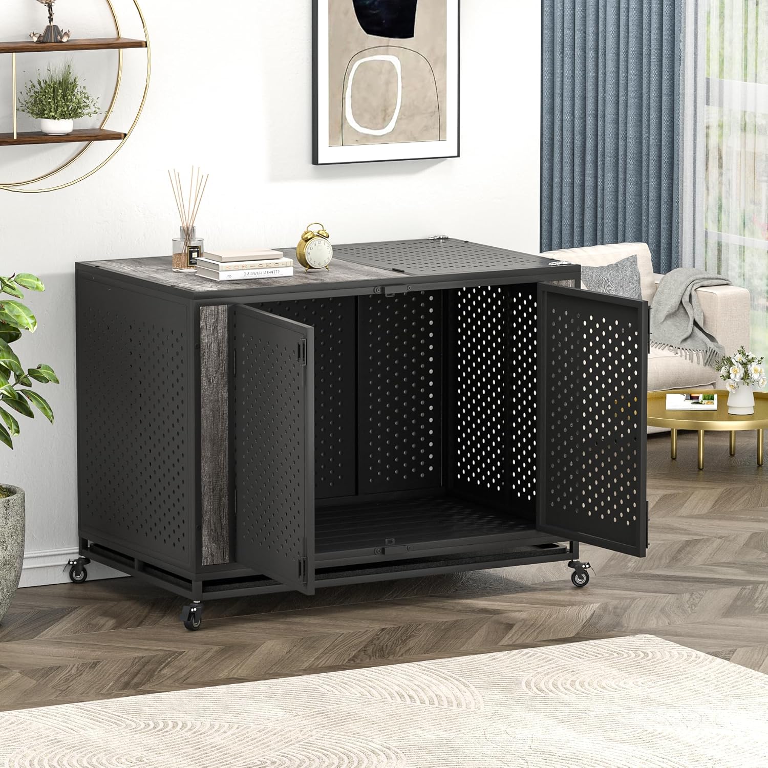 - [Washable Tray and Lockable Wheels] The dog cage comes with an entire washable plastic pan that simplifies the cleaning process. Additionally, the lockable wheels provide the flexibility to position the crate wherever needed with ease.
