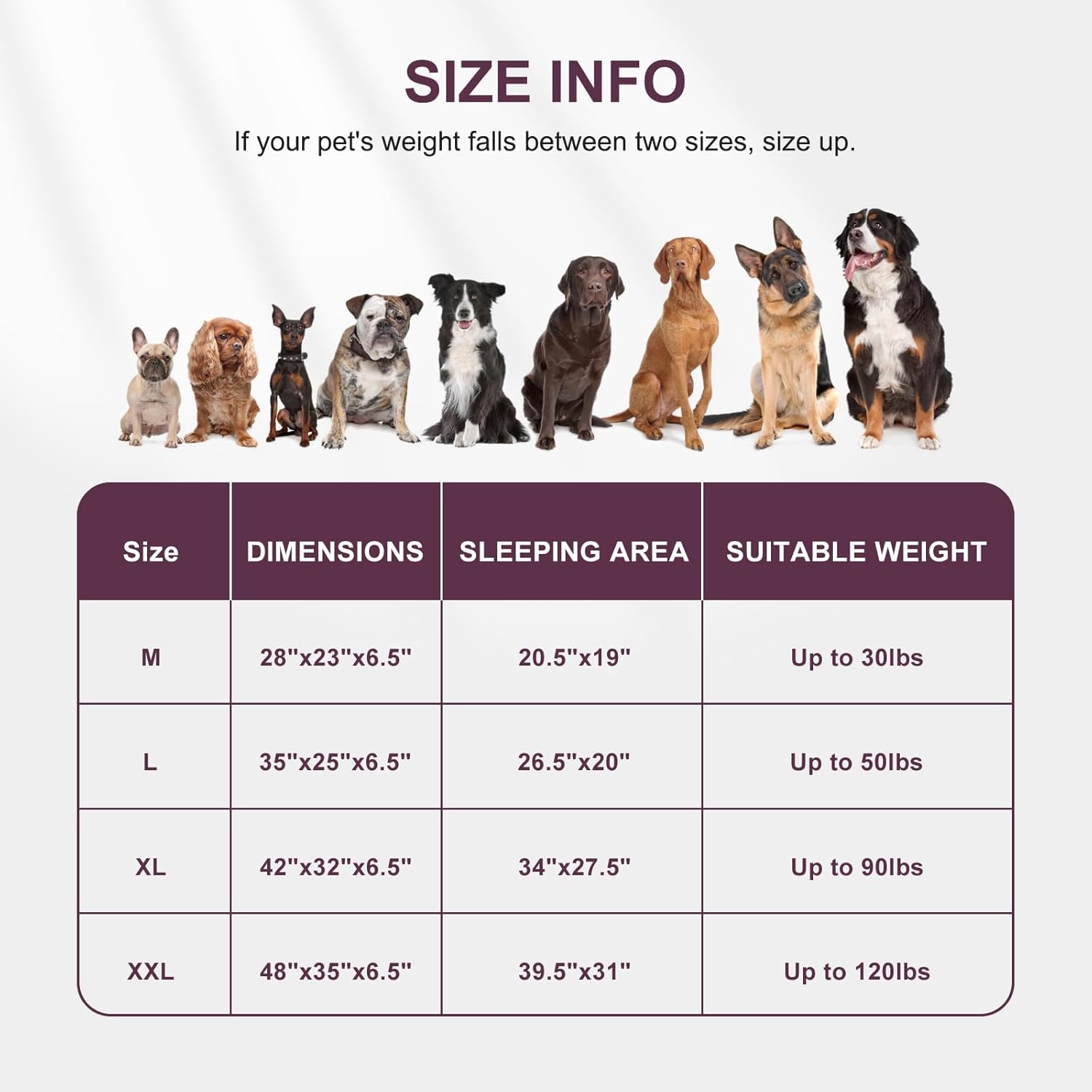 • Multiple Size Options: Orthopedic Dog Bed, Medium, 28" x 23" x 6.5" (3.5" Base Foam Height; Sleep Surface: Approx. 20.5" x 19") For Dogs Up to 30 lbs. Large - 35" x 25" x 6.5" (3.5" Base Foam Height;Sleep Surface: Approx. 26.5" x 20") For Dogs Up to 50 lbs. Extra Large - 42" x 32" x 6.5" (3.5" Base Foam Height;Sleep Surface: Approx. 34" x 27.5") For Dogs Up to 90 lbs.XXL -48" x 35" x 6.5" (3.5" Base Foam Height; Sleep Surface: Approx. 39.5" x 31") For Dogs Up to 120 lbs.