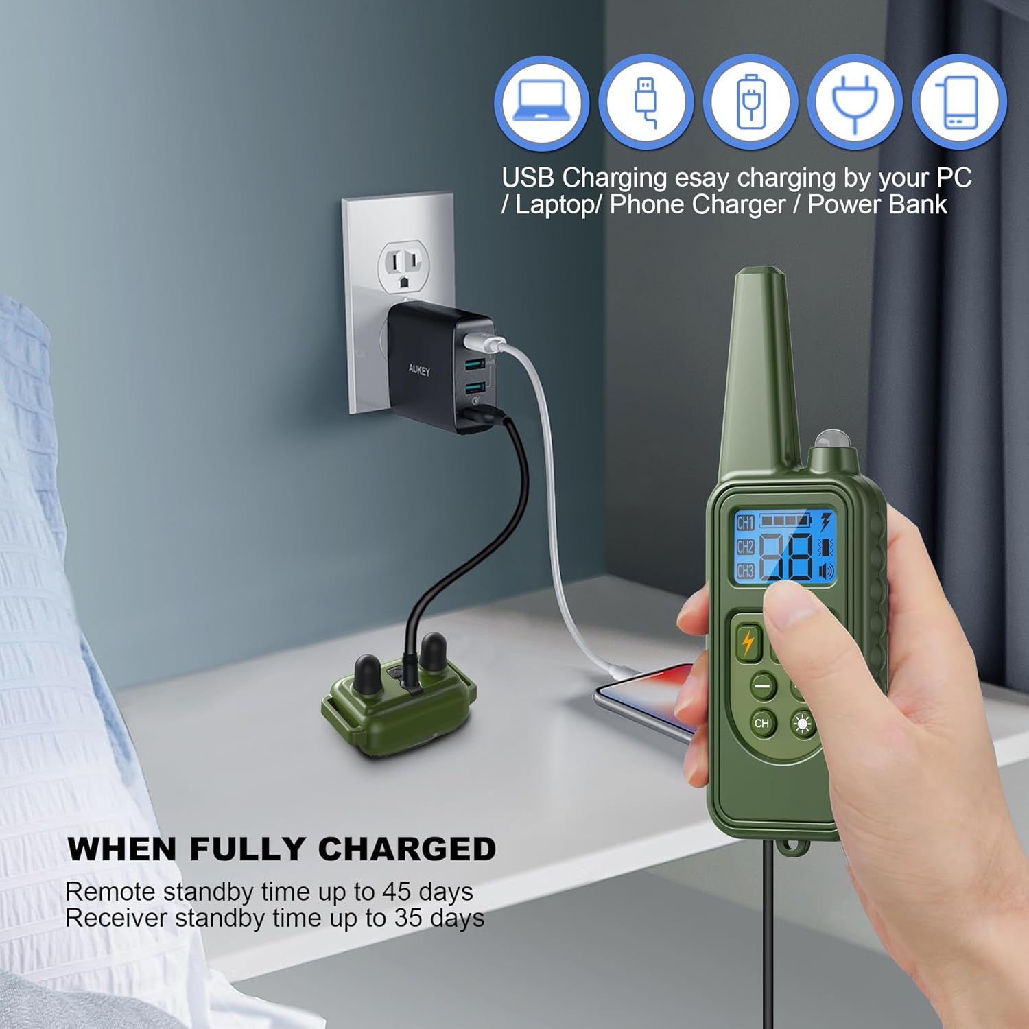 - Rapid Charging: Charge the Heaflex dog training collar in just 2.5 hours with USB. The receiver lasts up to 35 days on standby, and the remote up to 45 days. Quick recharging and long battery life ensure reliable and efficient training sessions