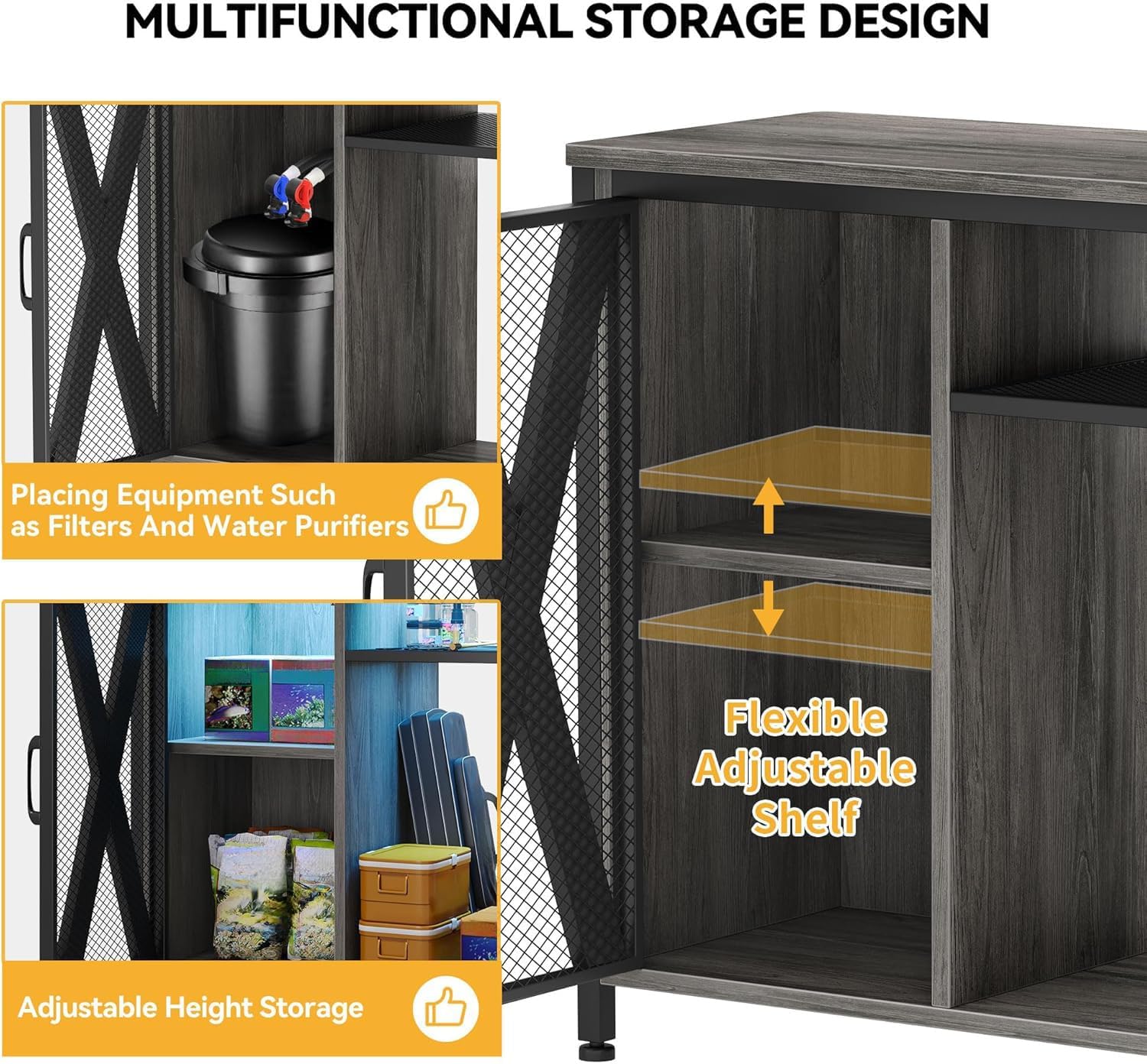 - Orderly storage: This fish tank with stand easily keeps everything organized. The built-in cabinet stores fish food, cleaning tools, and other accessories while the adjustable shelves help accommoda···te items of various sizes
