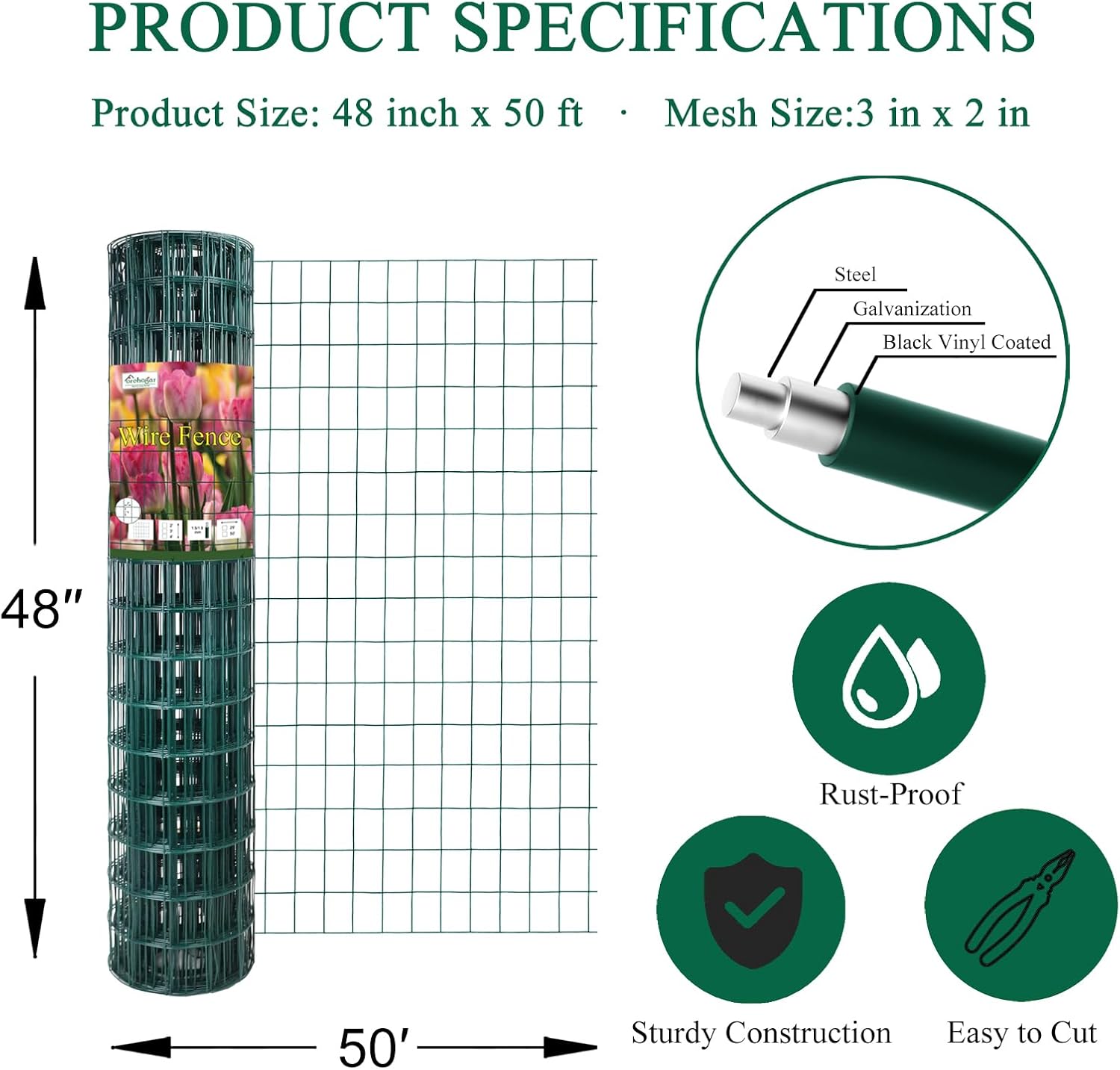 - FOREHOGAR welded wire garden fence is made of heavy duty galvanized wire and then coated with green vinyl. Rustproof and with long service life.