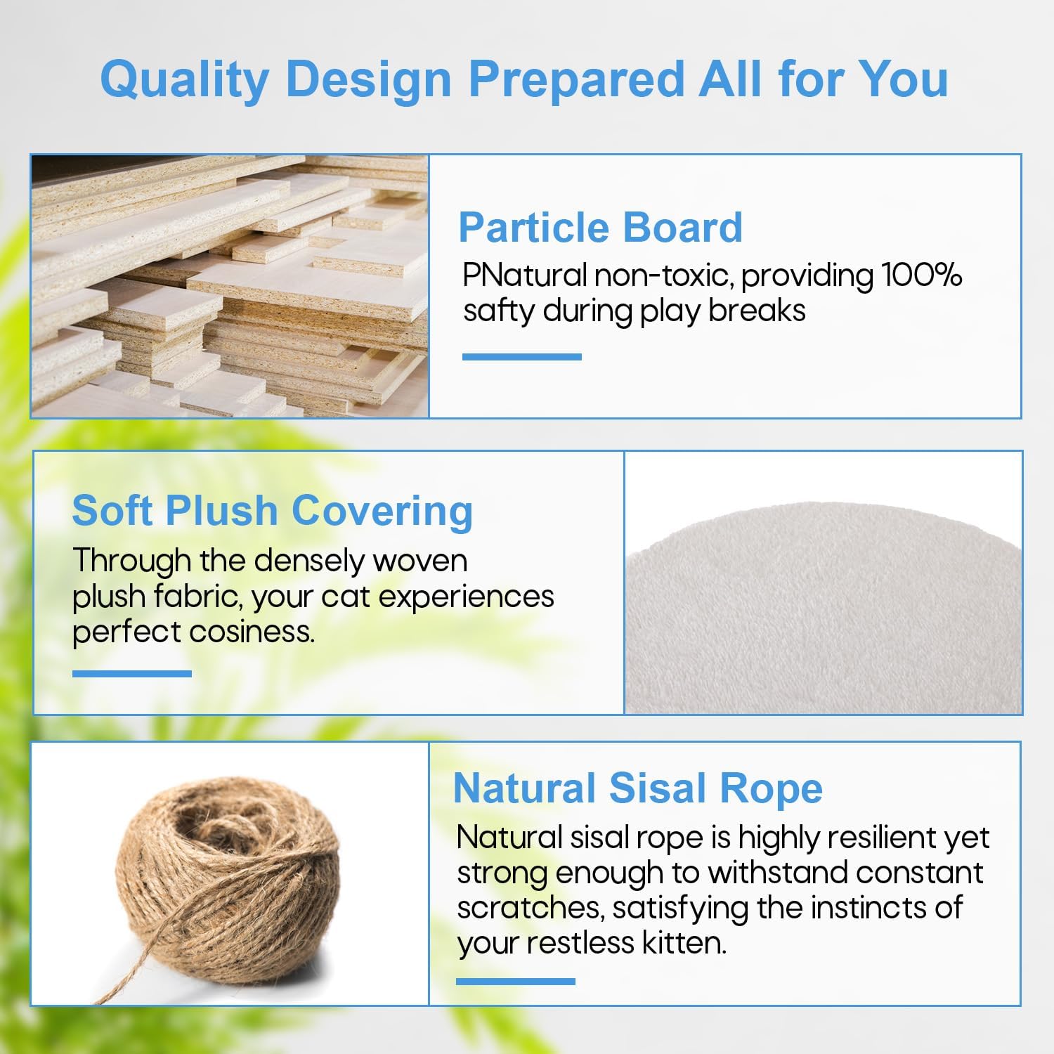 - 🐱 【Posts for Scratching Covered in Sisal 】These are scratching surfaces that are integrated into the framework. Cats love to bury their claws in sisal because it's a sturdy substance with a coarse texture. Our cat tree promotes healthy scratching habits and helps discourage cats from damaging furniture by offering dedicated spaces for them to scratch.
