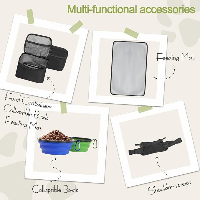 - 【The Dog Travel Organizer Kit Bag Ideal for everyday use for all of your essentials】: conveniently carries food, water, treats, leashes, Frisbee, pet toys, first-aid kit. Applicable Occasions: traveling, hiking, outdoor activities, go to the park.
