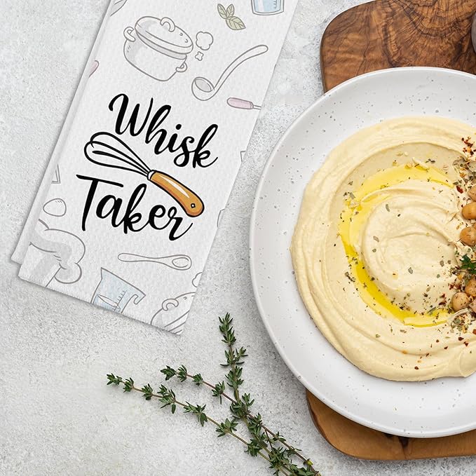 - Unique Design: Our funny kitchen towel with saying "Whisk Taker". The simple yet cute text patterns can bright up your kitchen and surprise your family and friends. It's a perfect kitchen gift for your favourite chef.
