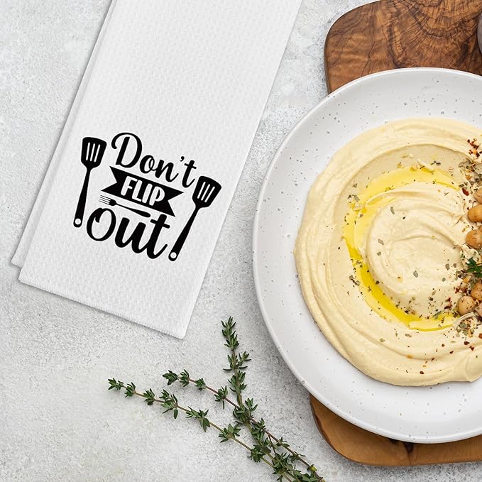 - Unique Design: Our funny kitchen towel with saying "Don't Flip Out". The simple yet cute text patterns can bright up your kitchen and surprise your family and friends. It's a perfect kitchen gift for your favourite chef.