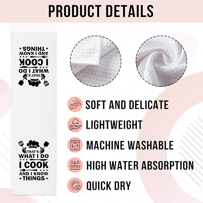 - Unique Design: Our funny kitchen towel with saying "That's What I Do I Cook and I Know Things". The simple yet cute text patterns can bright up your kitchen and surprise your family and friends. It's a perfect kitchen gift for your favourite chef.
