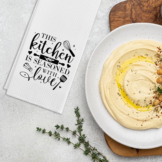 - Unique Design: Our funny kitchen towel with saying "This Kitchen is Seasoned with Love". The simple yet cute text patterns can bright up your kitchen and surprise your family and friends. It's a perfect kitchen gift for your favourite chef.