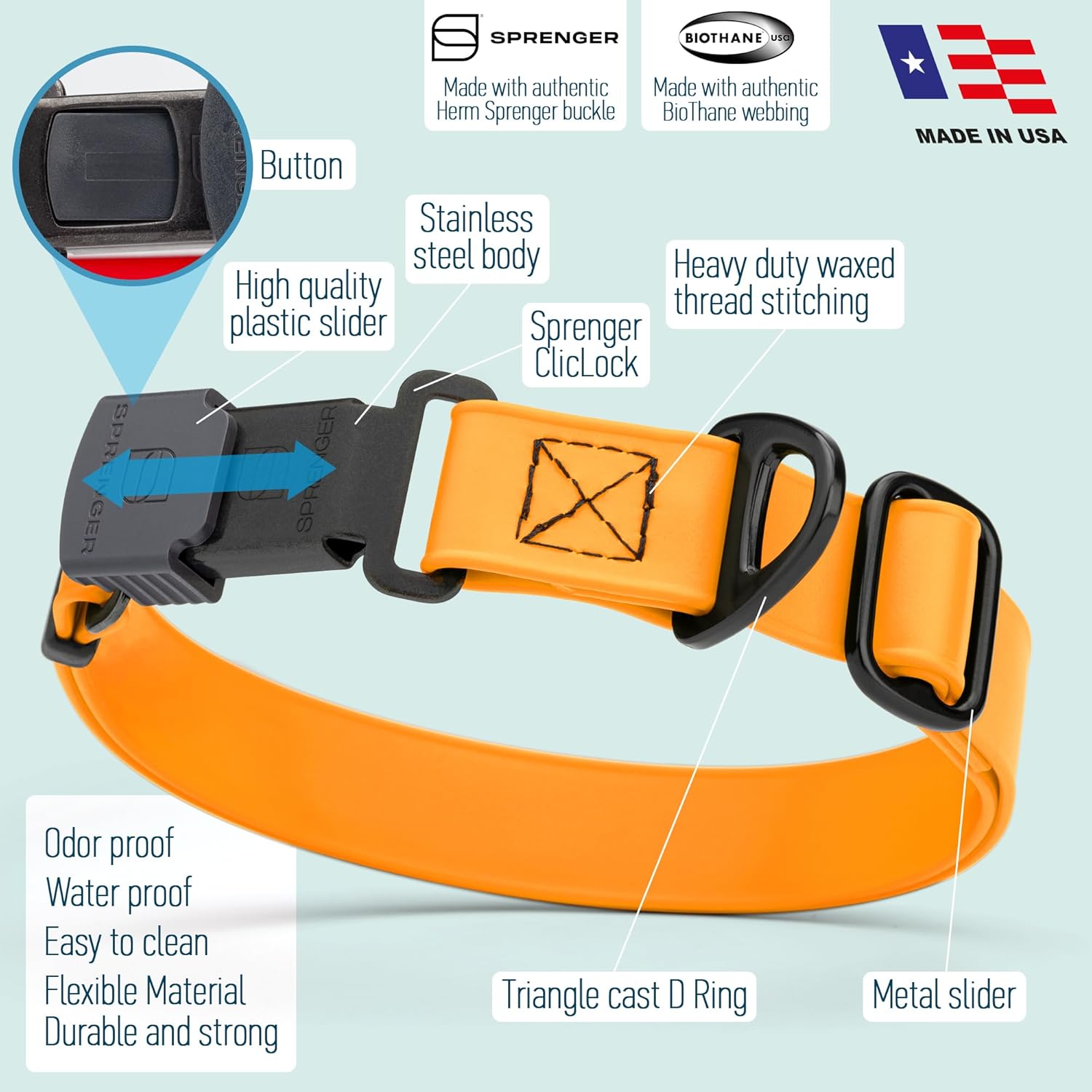 Dogline Biothane Waterproof Dog Collar with Herm Sprenger Stainless Steel Quick Release Buckle – Heavy Duty Tactical Durable Collar for Dogs – Comfortable and Safe Pet Collar, W 1" L 15-25", Tangerine