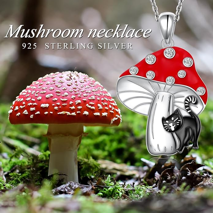- 🐈Black Cat Mushroom Necklace🍄: This mushroom pendant necklace features a black cat, which symbolizes luck, and a mushroom, which represents growth and change. The cat snuggles up to the mushroom, creating a warm atmosphere and bringing you luck and beauty. A great mushroom charms jewelry for women!