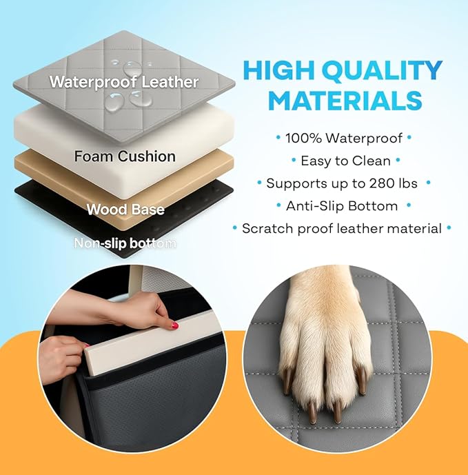 - Vegan Gray Leather with Door Protection: If you have a luxury vehicle, then you'll love the look of the upscale gray faux leather; This dog backseat cover also has door protectors for extra protection and 3 comfy, foam-wrapped plywood platforms that support up to 280 lbs