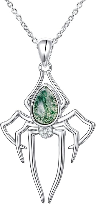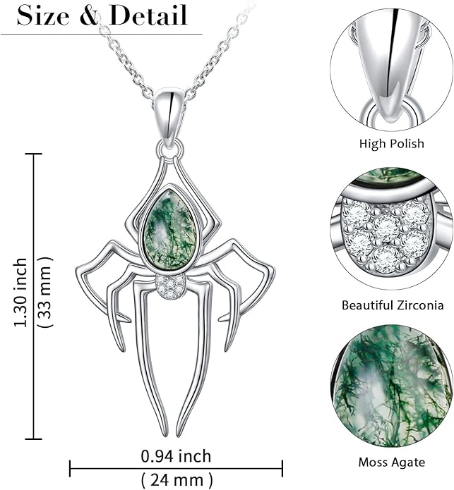 - ✨🕷Material: Made of premium 925 sterling silver, it is hypoallergenic, will not cause any burden to our skin. Selected natural green moss agate - "There are no two identical moss agates in the world, just like there is only one unique you in the world." Smooth corner treatments ensure the spider pendant necklace comfortable to wear!