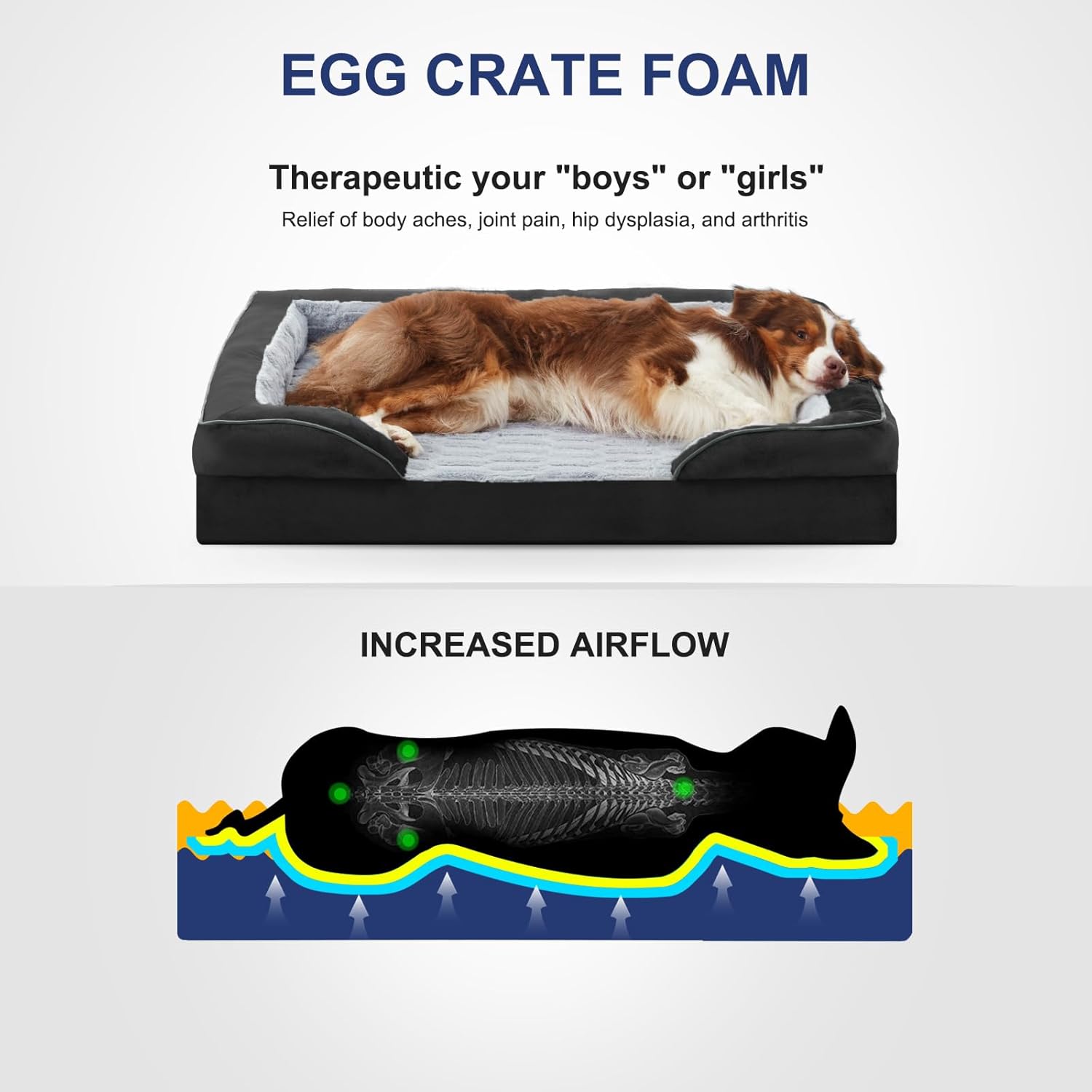 - Orthopedic Support: Our orthopedic dog sofa is designed to give your pet support for a comfortable deep sleep. High-density egg-crate foam helps distribute weight evenly and provides the perfect amount of pressure relief and joint support.