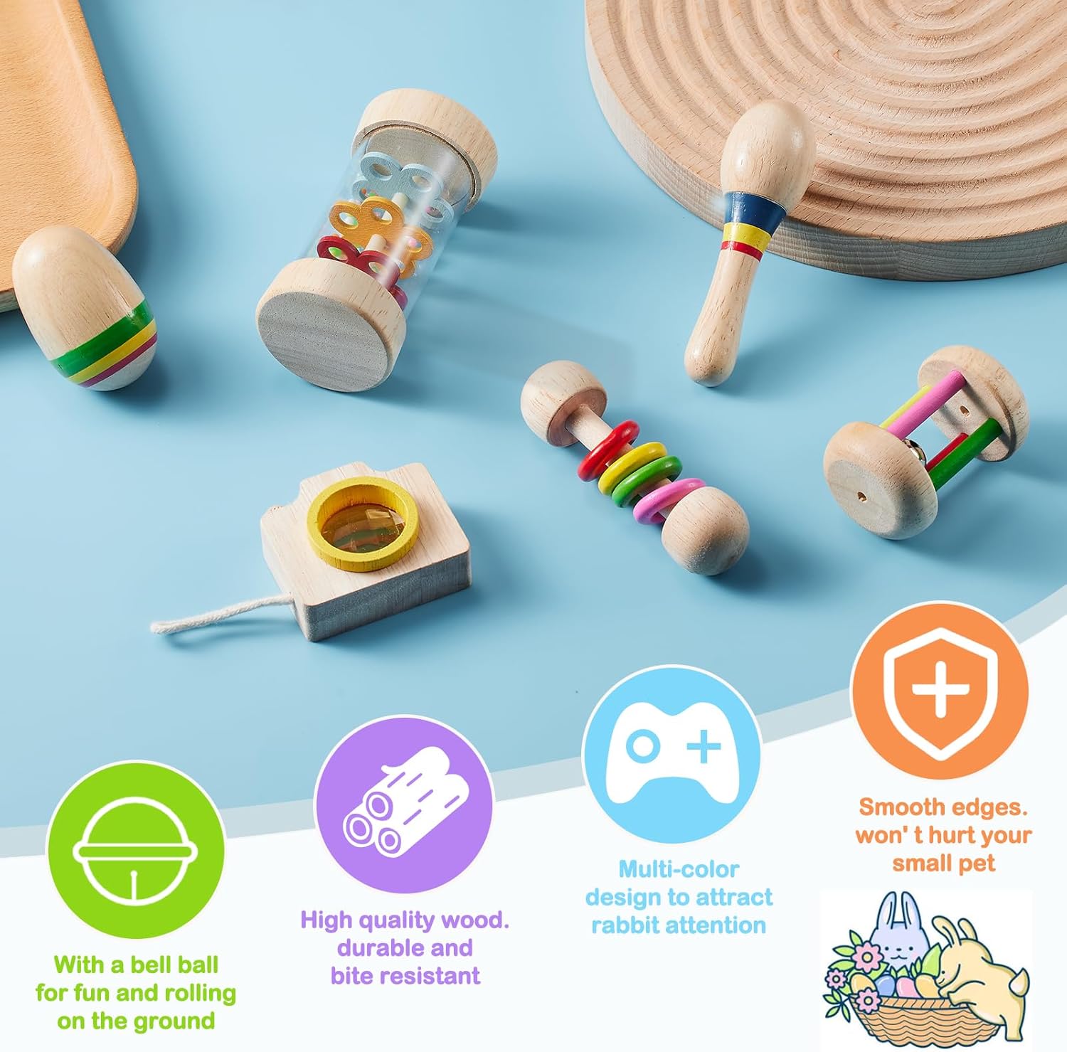 6 Pcs Wooden Bunny Toys - Safe Rabbit & Guinea Pigs Teeth Grinding Toys for Chinchillas, Hamsters & Small Animals - Indoor & Outdoor
