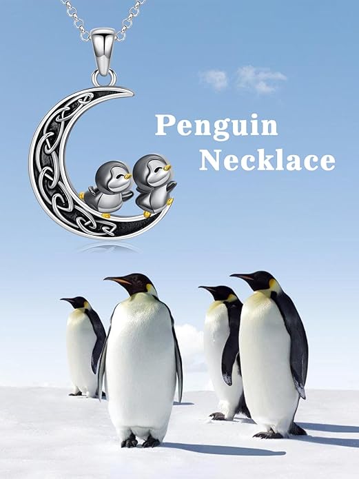 - Penguin Necklace Design:Penguins often symbolize resilience, determination, grace, wisdom and loyalty.This fun necklace depicts two adorable little penguins happily playing together on the celtic knot moon as if they were skiing in the snow. Wear this penguin necklace and let it bring you innocence, happiness and good luck