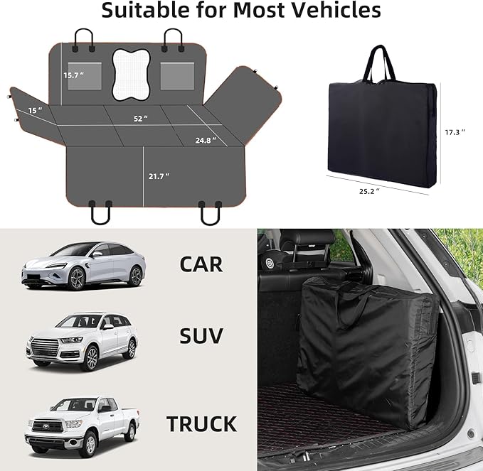 - Universal Fit & Quick Installation – Measuring 52”L x 24.8”W, this back seat extender for dogs fits most cars, SUVs, and trucks. Installs in seconds with adjustable straps and includes a carrying bag for travel convenience