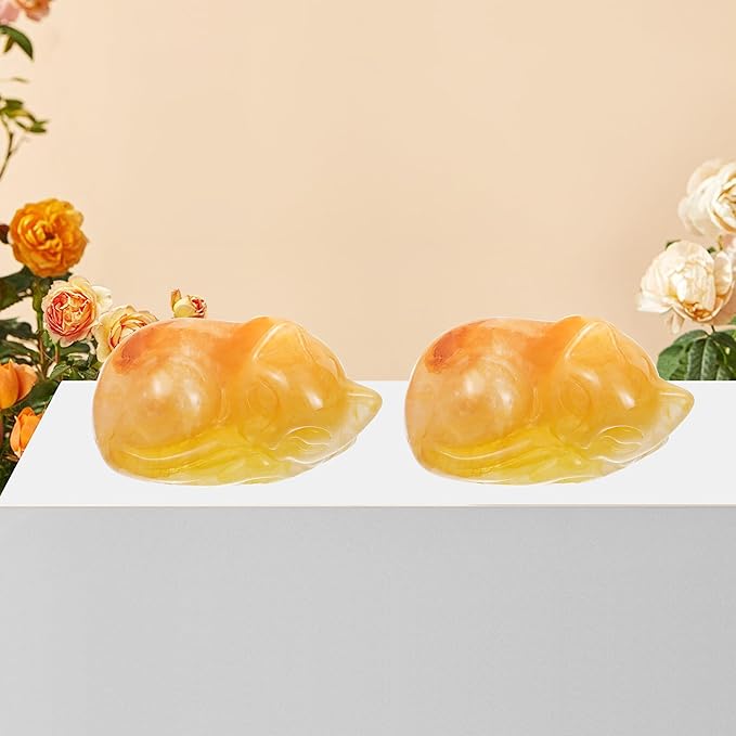 2" Sleeping Cat Statue Citrine Healing Crystals Hand Carved Cute Kitten Figurine, Worry Stone for Anxiety Relif Home Desk Decor Animal Figurine.
