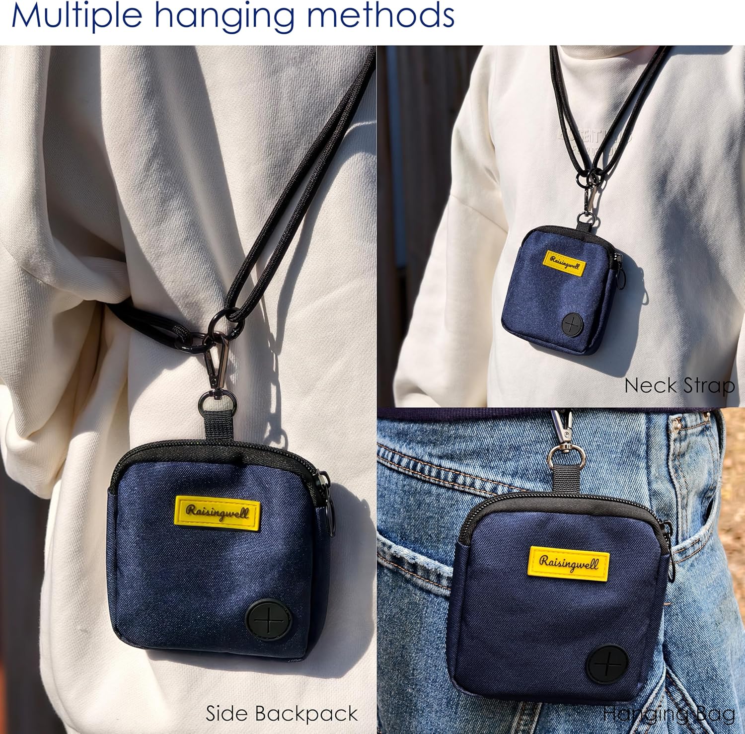 - Raisingwell Dog T1、Fashion Design: This dog training treat bag measures 4.9 x 5.1 inches and offers versatile wearing options. It comes equipped with a carabiner and a strap, allowing you to hang it on your leash, attach it to your pet's collar, or even wear it as a trendy accessory on your bag. The bag features a zipper closure, ensuring that treats stay secure inside even when you're playing with your pet afterward. It's perfect for carrying around or using during short outings.reat Pouch