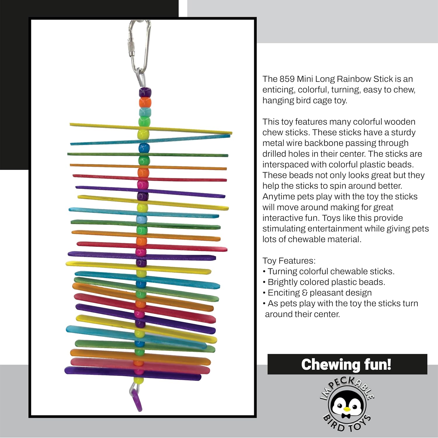 - This toy has a straightforward, pleasant design thats easy to introduce to pets of all temperaments. The toy looks great in cages and aviaries with its brightly colored sticks and beads.