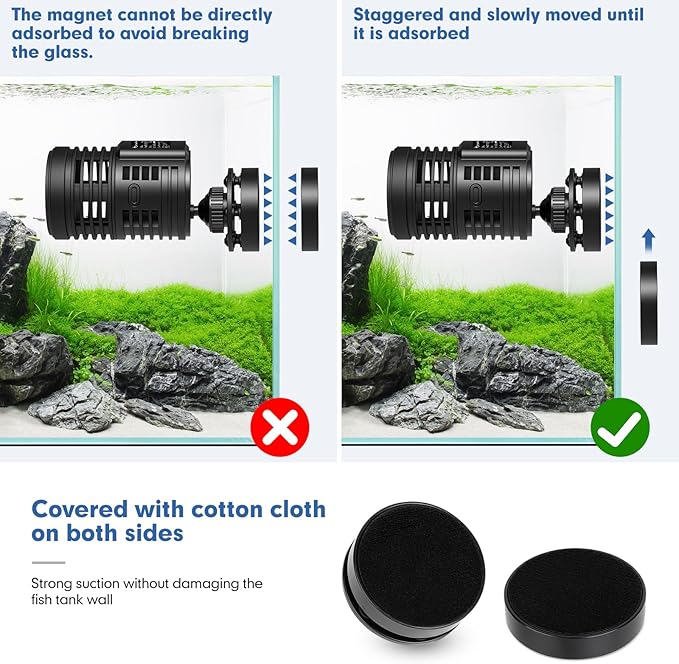 - Strong magnetism and ultra-quiet: The aquarium circulation pump uses a double-sided cotton magnetic brush to prevent scratches on the fish tank glass, and has five uniquely designed shock-absorbing and sound-insulating silicone pads. The adsorption is more stable and can achieve effective silence, and the water pump will not fall off easily. Easy to install anywhere on the fish tank wall.
